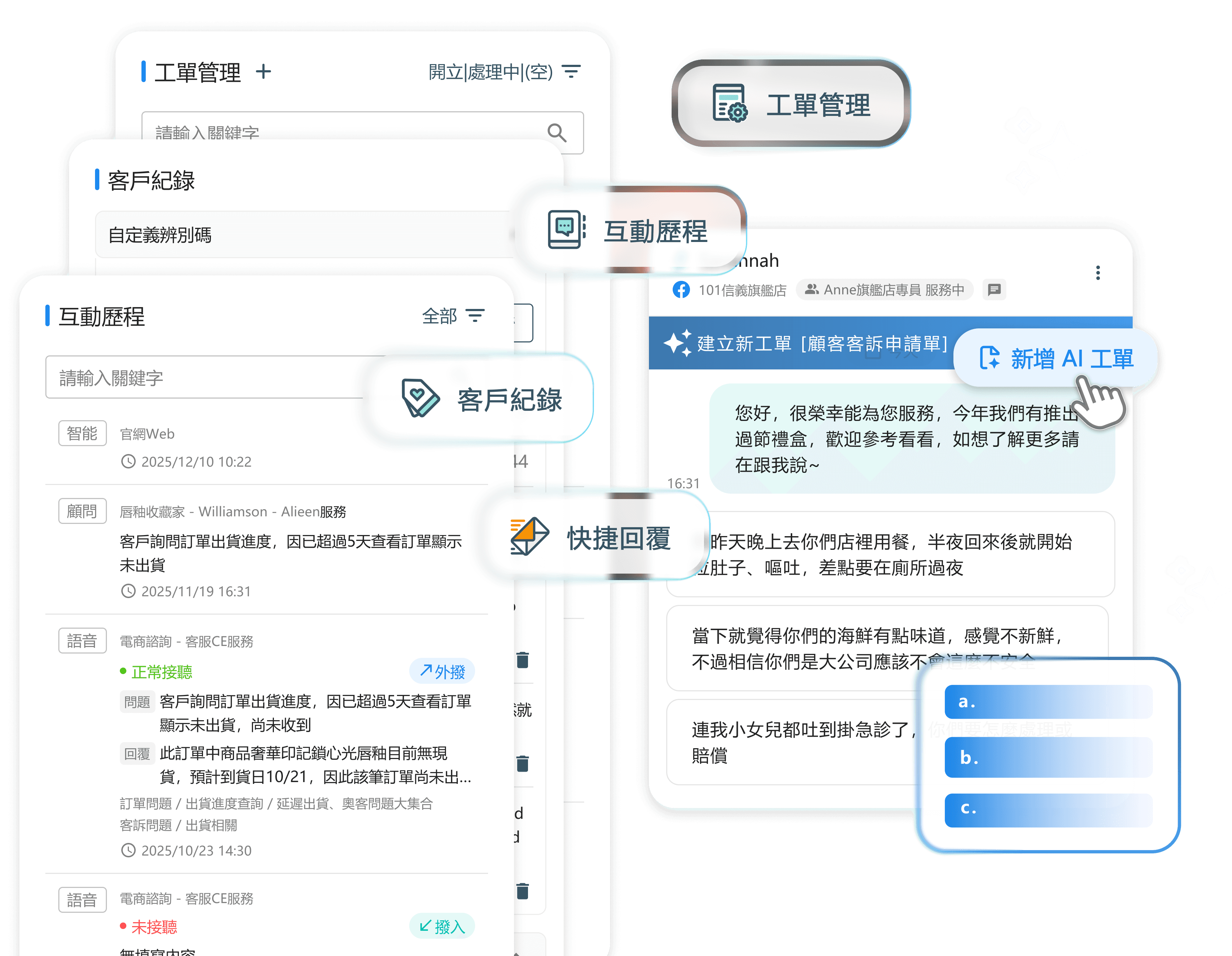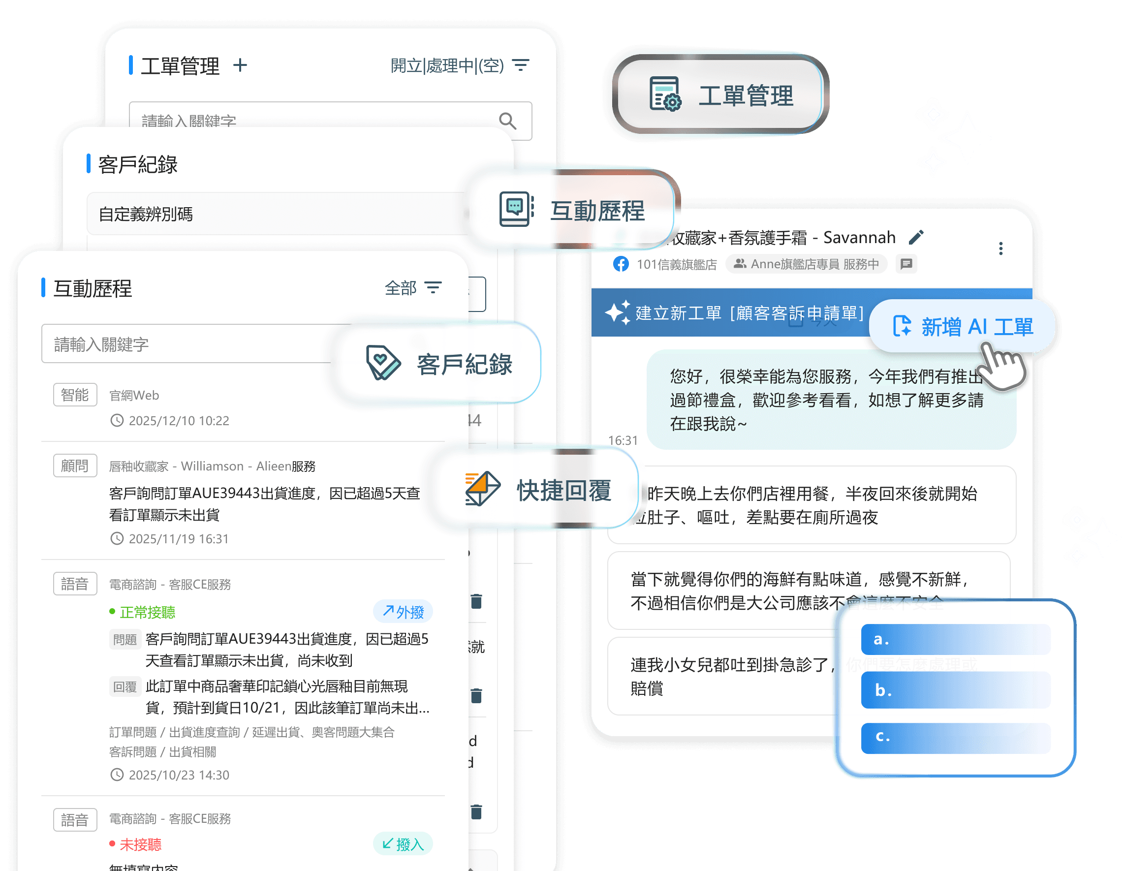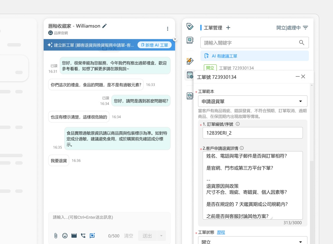 對話直接串接工單、系統與真人專員,不需要在多個工具間切換。