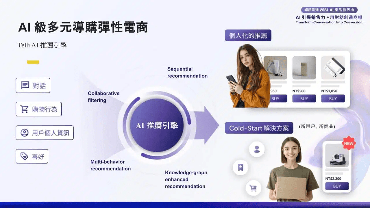 「AI多元導購電商」運用「網訊大腦」的Telli AI推薦引擎,通過分析顧客的對話紀錄、個人資料和購買歷史,自動推薦最符合顧客需求的商品,輕鬆聊天就能完成購買!此系統支持一頁式快銷和官網電商雙重型態,並在同一頁面完成結帳,大幅縮短購物流程,提升購物的流暢度和轉化率。