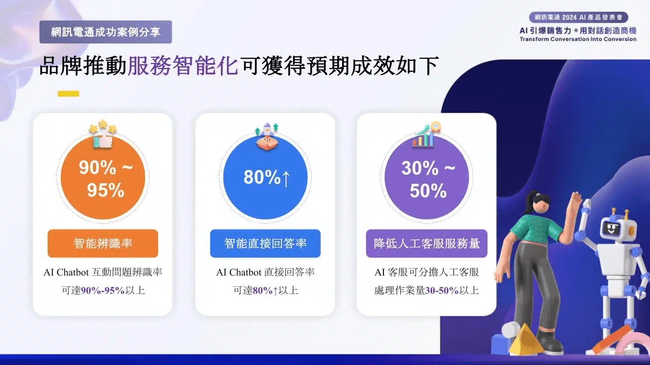 執行長陳諧表示,這兩大解決方案將從客服、電商兩大實際應用場景,提升40% 服務效率與 20% 銷售轉化率。這次活動吸引了超過 300 位業界品牌高層於線上參與,展現了市場對於創新 AI 技術結合電商應用場景的需求與期待。(以下內容轉載自工商時報 簡立宗 20240927〈AI 助力品牌逆勢突圍!網訊電通發表「AI 客服 360」與「AI 多元導購電商」,激發新銷售動能〉)
