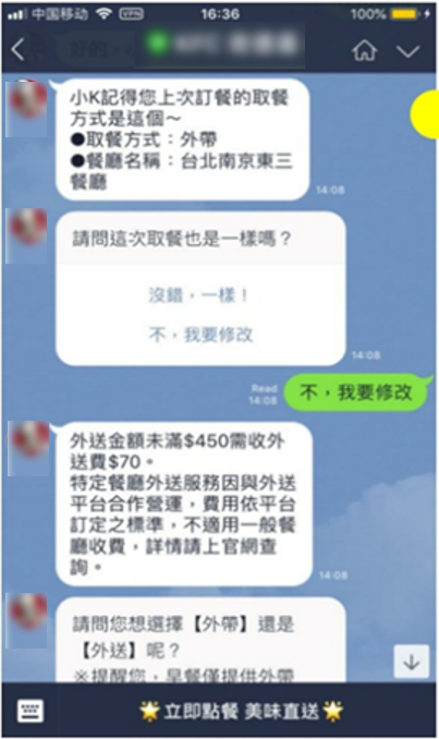 啟動訂餐後,訂餐機器人會自動帶入訂購人歷史資訊,包含姓名、手機號碼、email、過往取餐方式與所選擇的餐廳,減少重複填寫資訊的繁瑣流程。