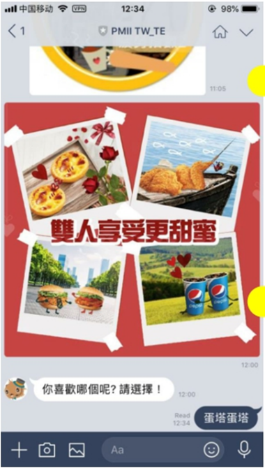透過互動問題的設計,蒐集消費者靜態資訊如生日日期,或以此方式了解消費者口味喜好。機器人再根據消費者回答的資訊,完成自動貼標,同時提供 LINE 專屬優惠券,讓消費者立即使用完成導購。