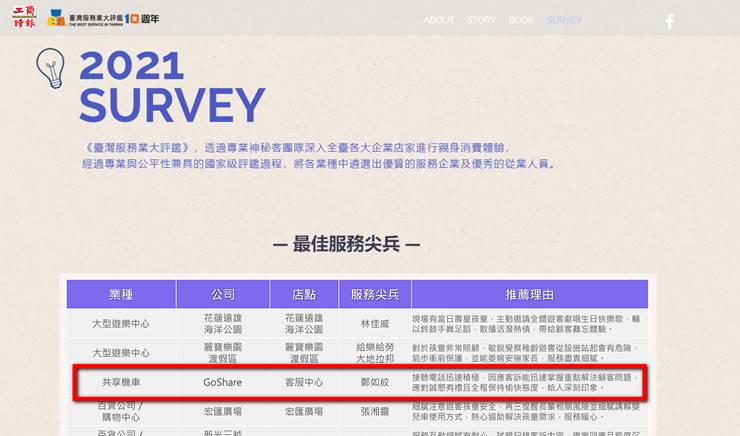 全台评鉴规模最大、涵盖34个业种与364家企业的「台湾服务业大评鉴」,今年迈入第十届并首度纳入共享机车业,GoShare移动共享服务即摘下「共享机车业」金牌奖桂冠,并获得「服务尖兵奖」与「2021 年度20家魅力服务品质精选」的肯定!