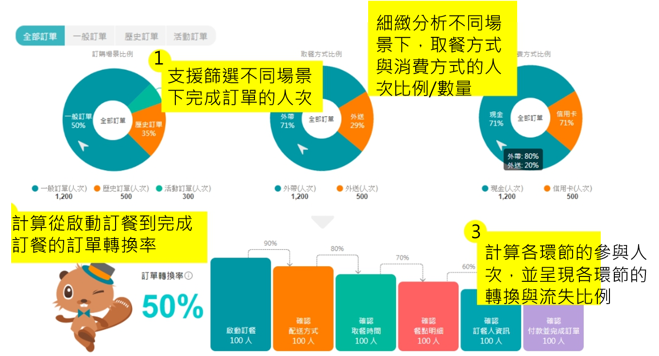 想知道订餐机器人的成效如何?不论是取餐方式的人次比例、各环节的转换与流失比例,还是订单转换率等等,都可以从后台一目了然。当品牌掌握了数据,就等于掌握了未来的策略依据。