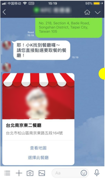 当用户选择外带餐点时,订餐机器人会推送「分享位置讯息」的按钮,让用户一键点击、迅速定位,减少手动输入地址的繁琐流程。