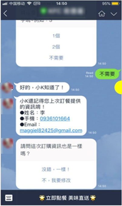 启动订餐后,订餐机器人会自动带入订购人历史资讯,包含姓名、手机号码、email、过往取餐方式与所选择的餐厅,减少重复填写资讯的繁琐流程。