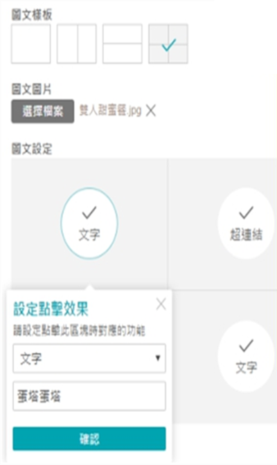 透过活动贴标之后,机器人可针对特定群体推送相关讯息,非该筛选条件者,不会收到讯息干扰,借此达到分众营销的目的。弹性的图文模板设计,让消费者跟品牌产生更好的互动体验。